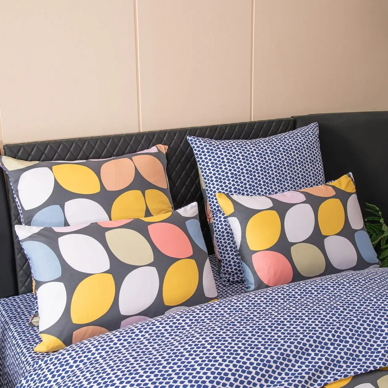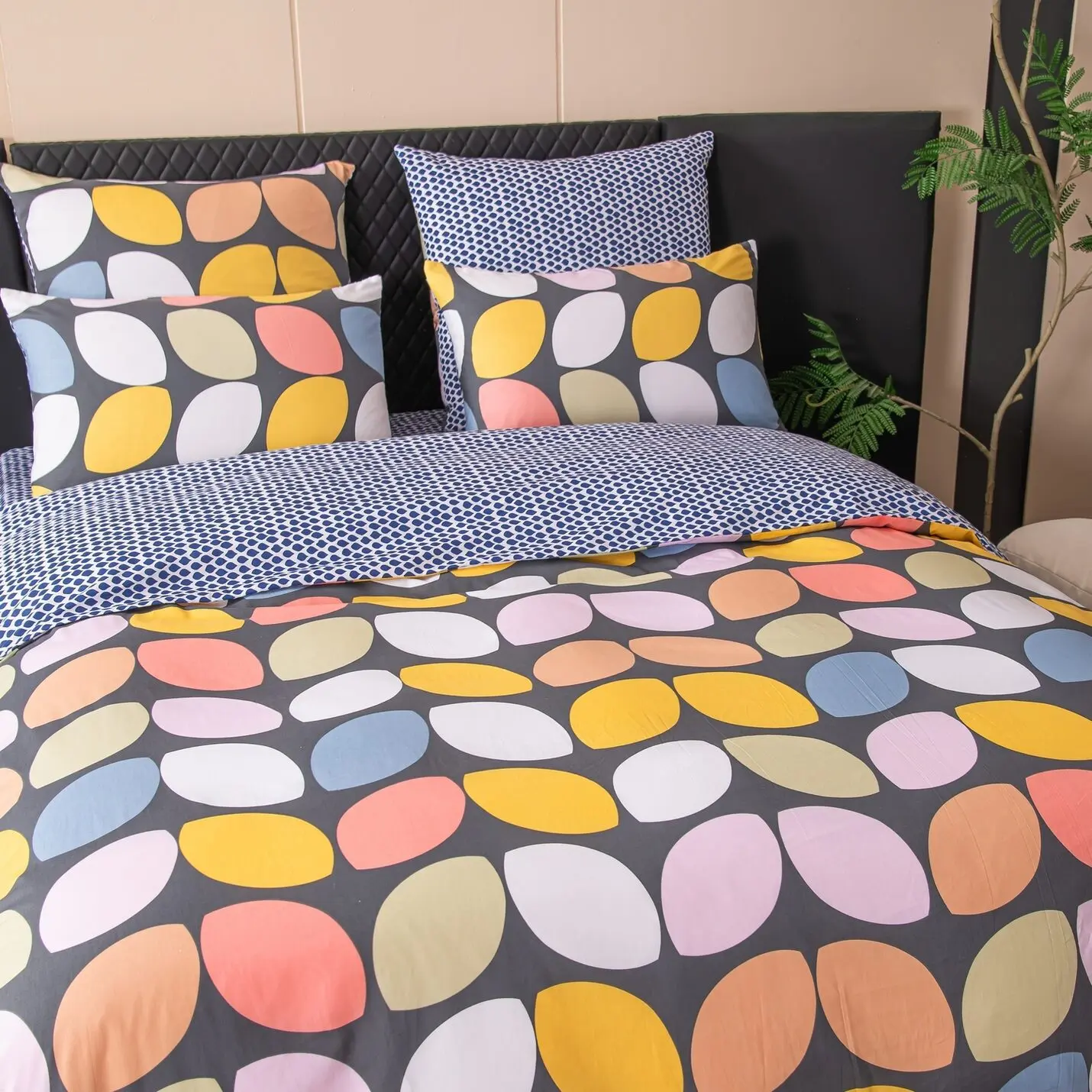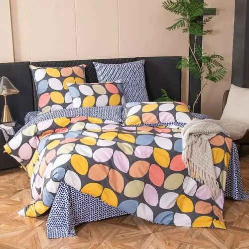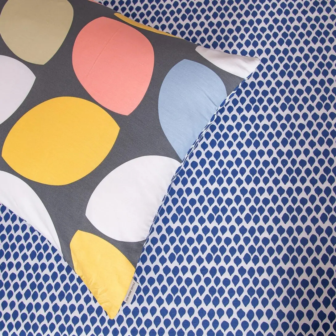 Ткань компаньон: Наволочки с разных сторон разной расцветки, пододеяльник с разных сторон разного цвета, простыня такого же цвета, как низ пододеяльника.