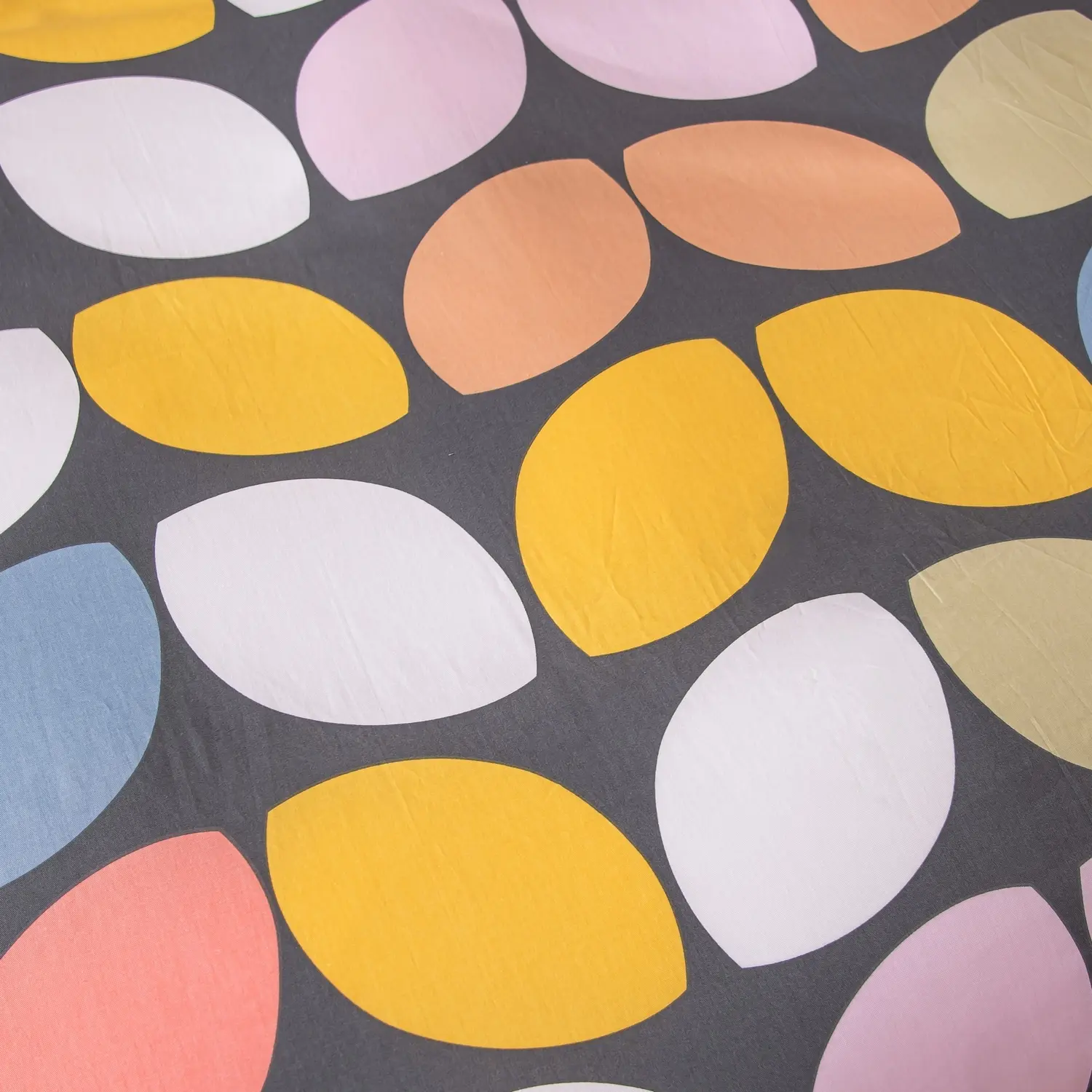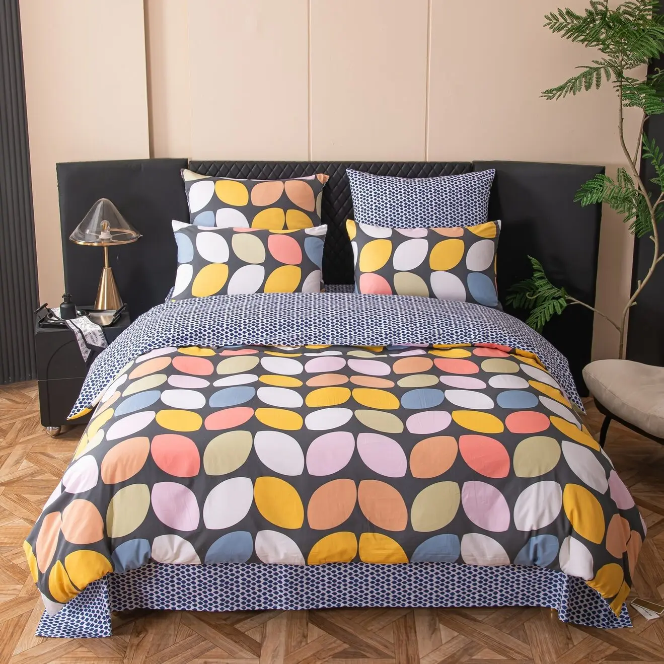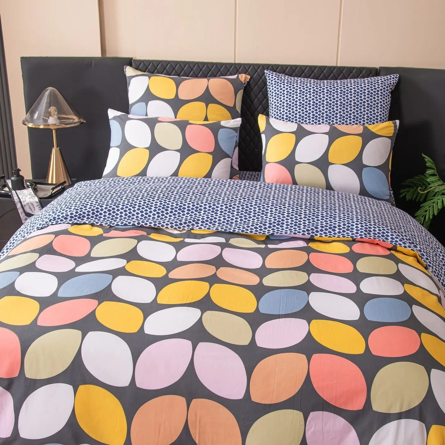 Ткань компаньон: Наволочки с разных сторон разной расцветки, пододеяльник с разных сторон разного цвета, простыня такого же цвета, как низ пододеяльника.