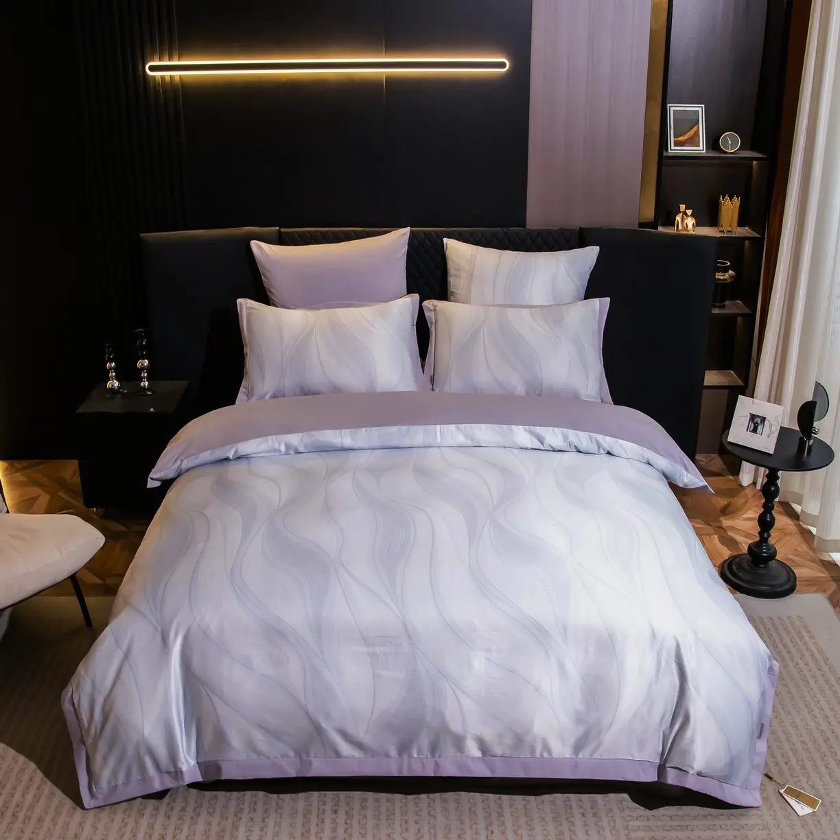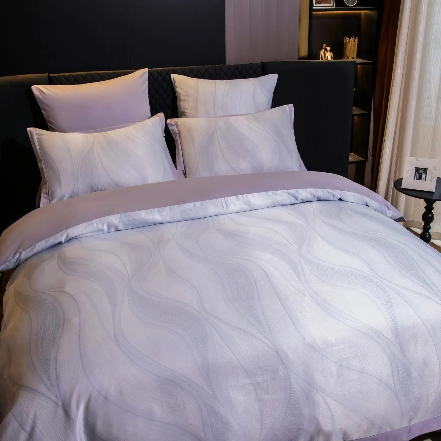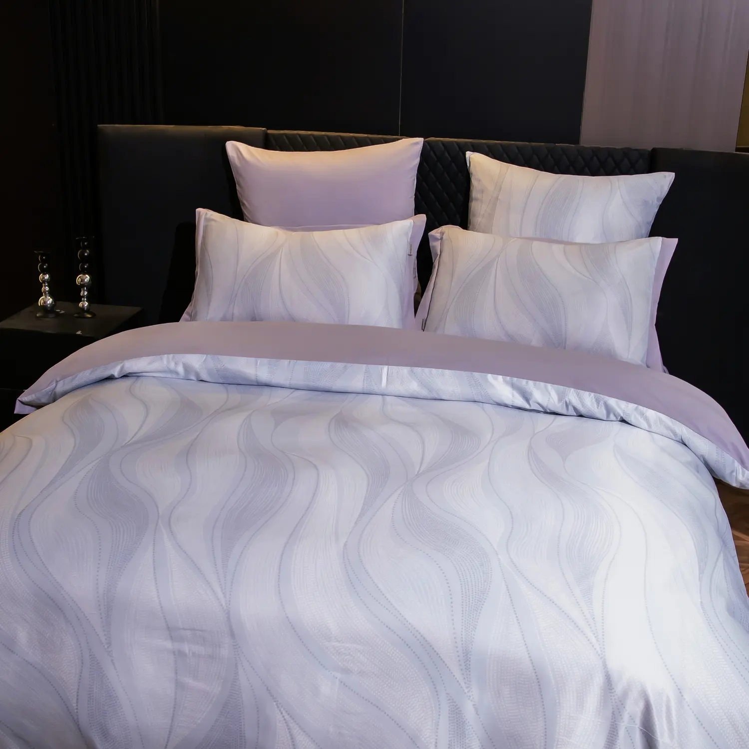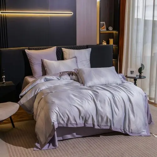 Ткань компаньон: Верх пододеяльника - мерсеризованный сатин, низ пододеяльника - сатин. Наволочки 50*70 см и 70*70 см с разных сторон разной расцветки. Пододеяльник с разных сторон разного цвета. Простыня однотонная такого же цвета, как низ пододеяльника.