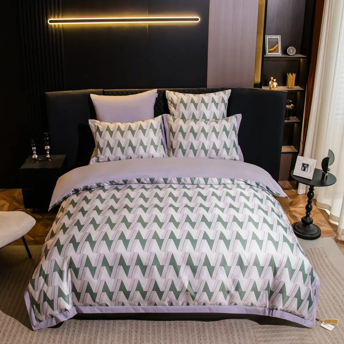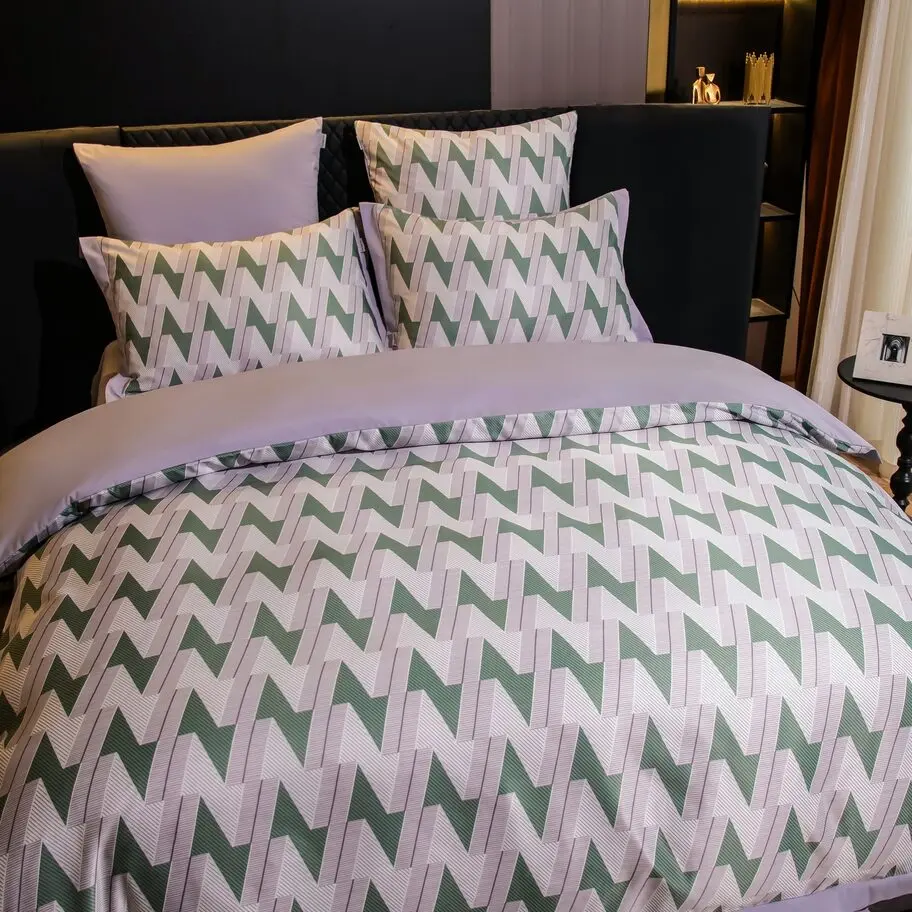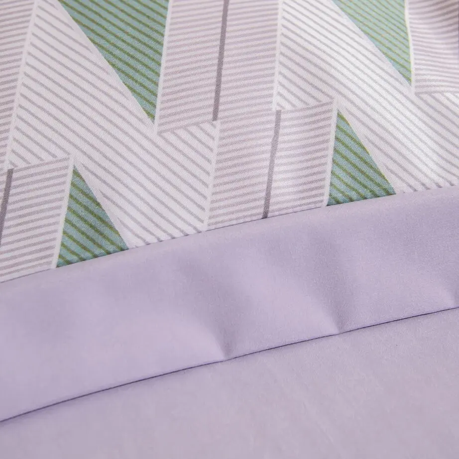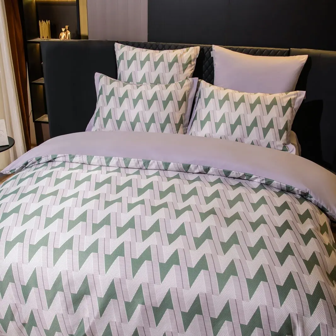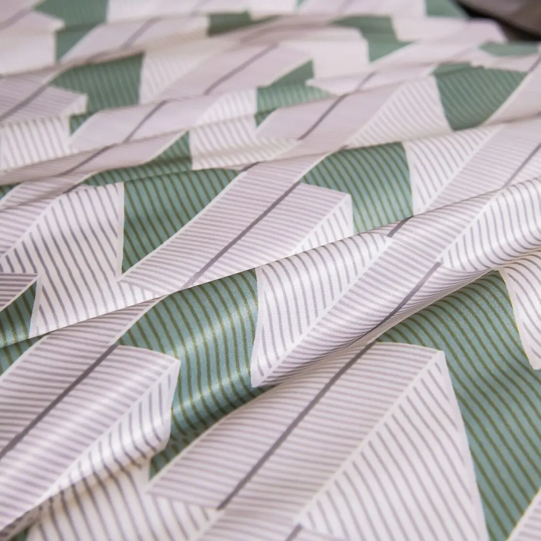Ткань компаньон: Верх пододеяльника - мерсеризованный сатин, низ пододеяльника - сатин. Наволочки 50*70 см и 70*70 см с разных сторон разной расцветки. Пододеяльник с разных сторон разного цвета. Простыня однотонная такого же цвета, как низ пододеяльника.