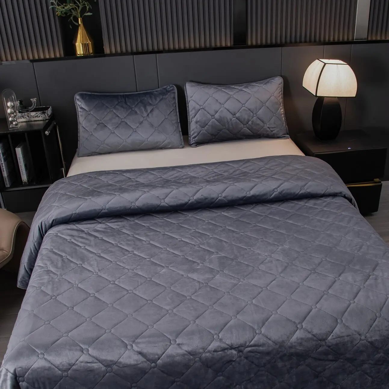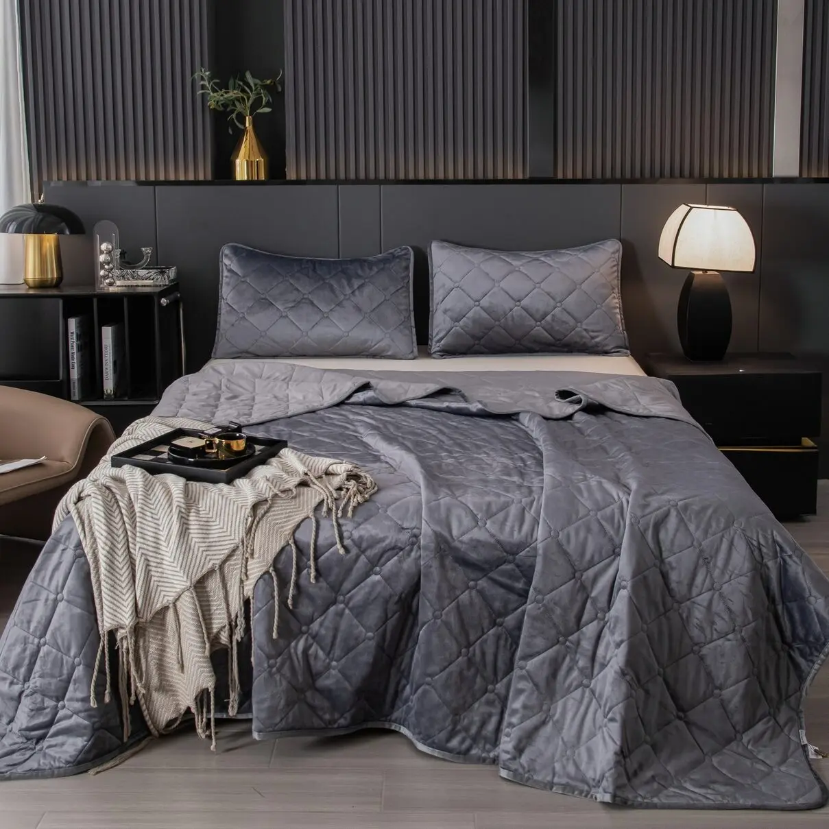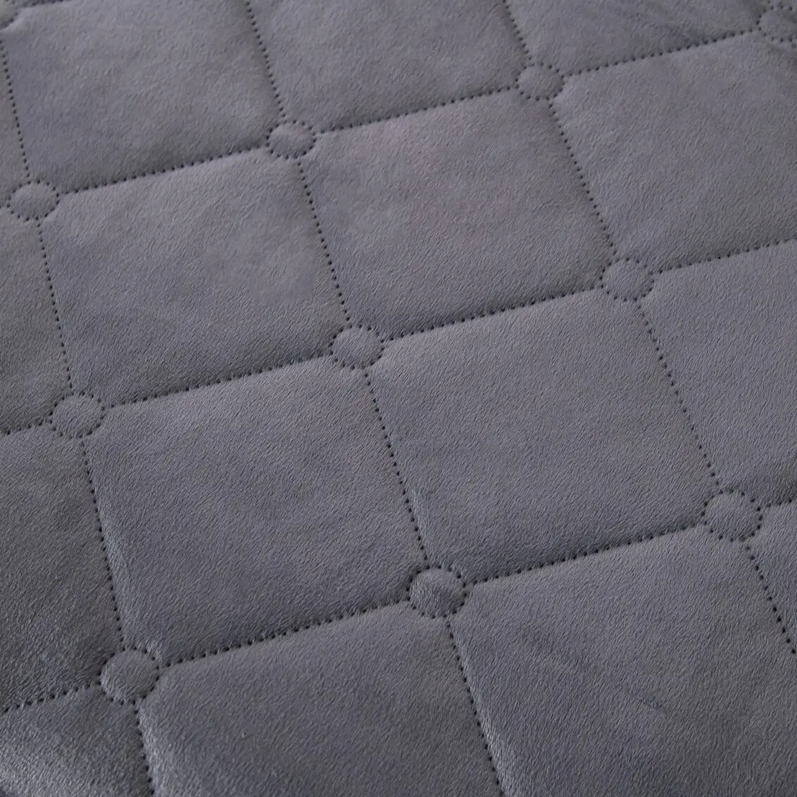 Ромбовидный узор на покрывале выполнен с использованием термостежки, что придаёт изделию особую изысканность и подчёркивает элегантность интерьера.