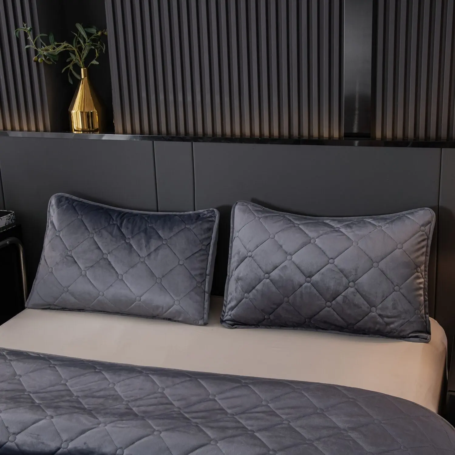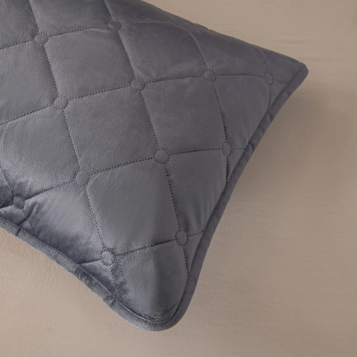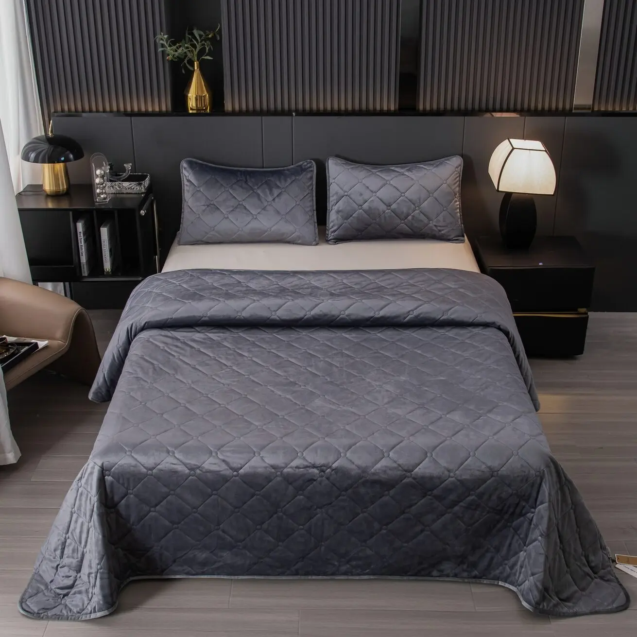 Ромбовидный узор на покрывале выполнен с использованием термостежки, что придаёт изделию особую изысканность и подчёркивает элегантность интерьера.
