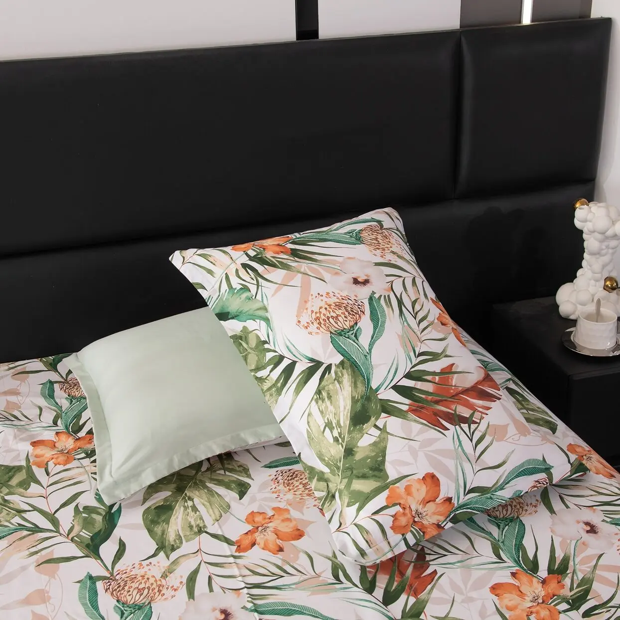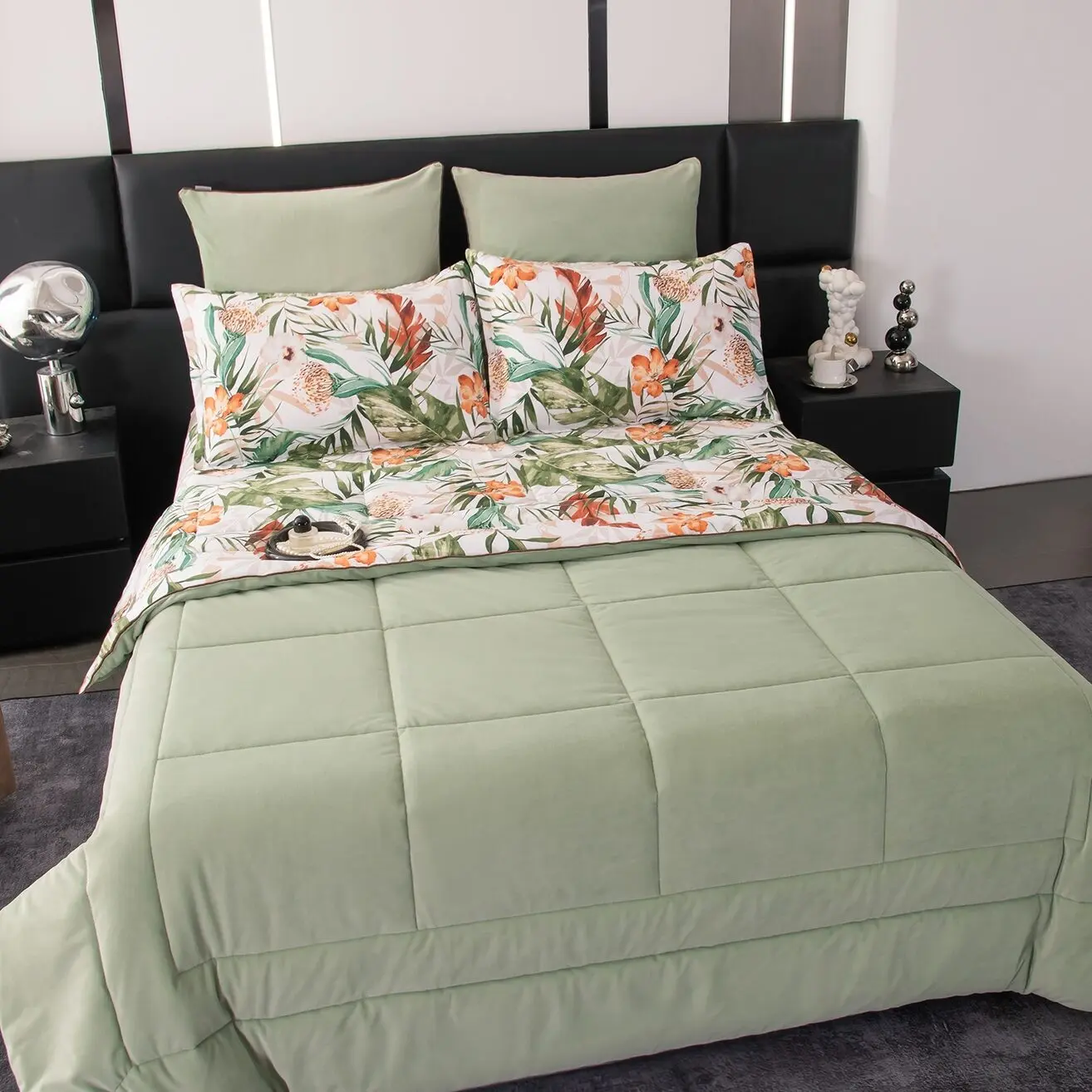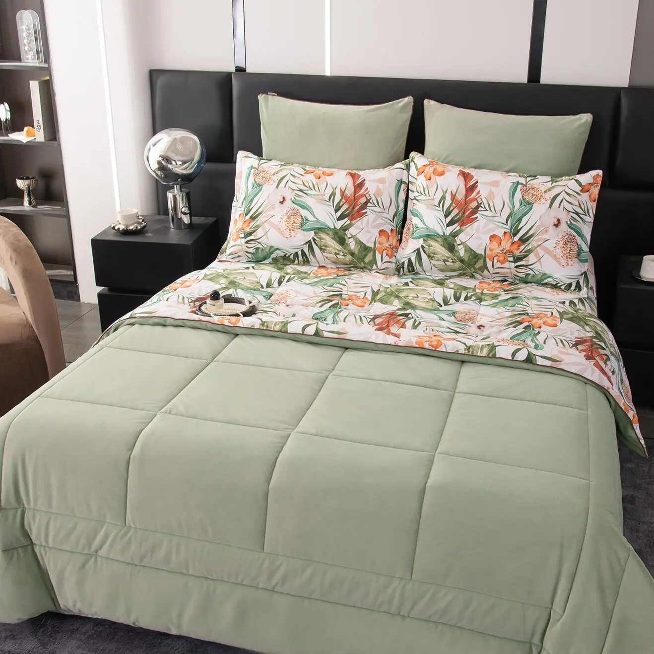 Ткань компаньон: Одеяло и наволочки 70x70 с разных сторон разной расцветки и ткани; наволочки 50x70 с разных сторон разной расцветки (принт/однотонный); простыня такого же цвета, как низ одеяла.