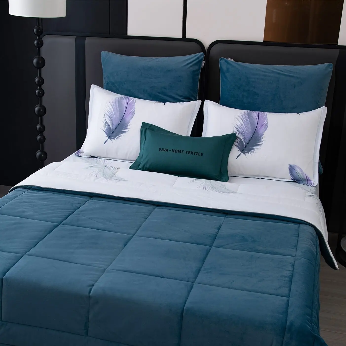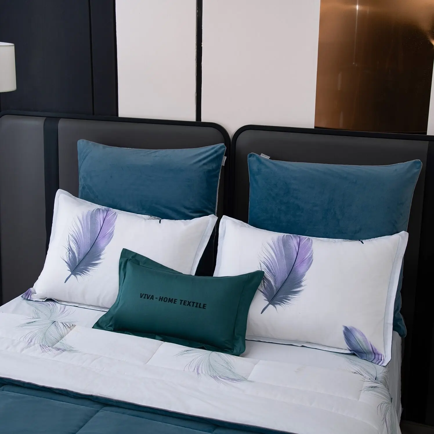 Ткань компаньон: Одеяло и наволочки 70x70 с разных сторон разной расцветки и ткани; наволочки 50x70 с разных сторон разной расцветки (принт/однотонный); простыня такого же цвета, как низ одеяла.